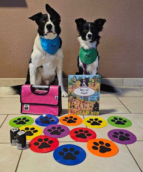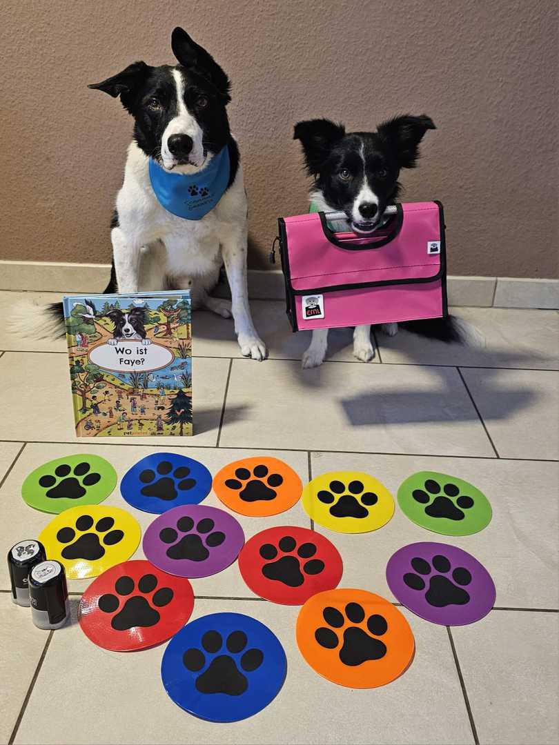 Guinness und Faye bedanken sich ganz herzlich beim Nachabrschaftsverein für die Unterstützung unseres Schulhundprojektes. Wir freuen uns über 2 personalisierte Stempel, 12 Bodentargets, ein personalisiertes Wimmelbuch und ein tolle Tasche zum Apportieren!